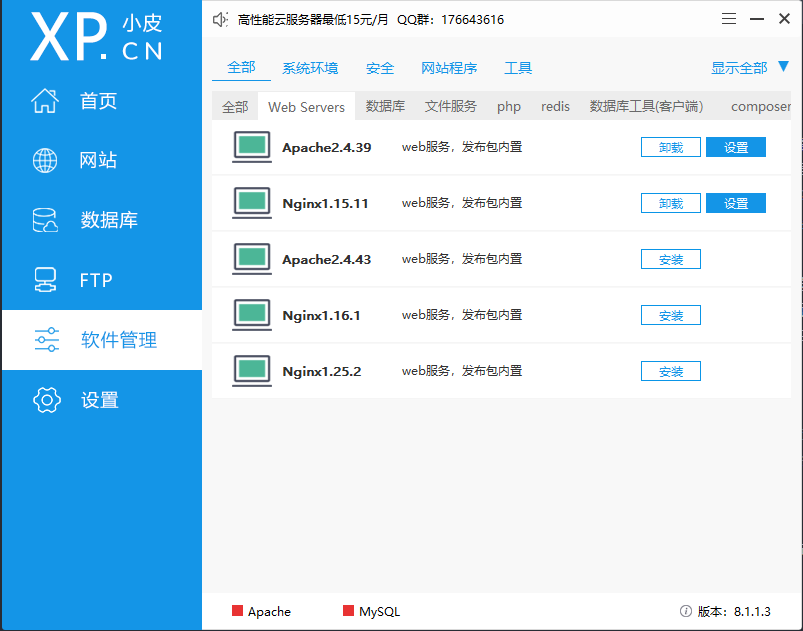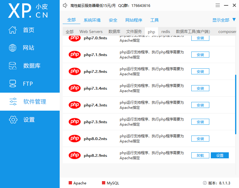 在小 P 面板下载 nginx 服务后,再下载一个 laravel 需要的 php 版本,比如我使用的是 laravel10.x,那么需要的 php 版本为 8.2