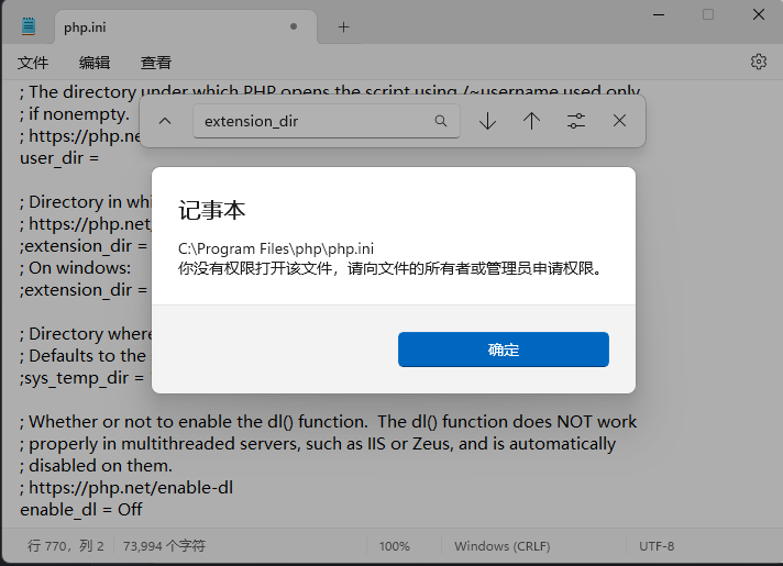 将 PHP 系统环境不指向 C 盘,而是将 PHP 系统环境放在其他盘,这样就可以避免权限问题了
