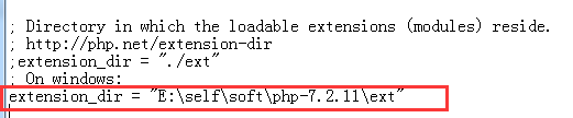 搜索 extension_dir 找到配置项,把该配置项设置成 php 目录下 ext 的绝对路径(最好是绝对路径,也可以是相对路 径"./ext"),如图: